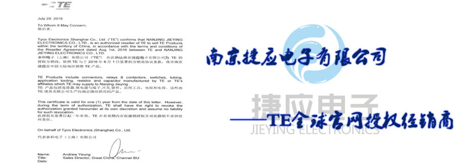 南京捷應電子有限公司是國際無源器件品牌美國泰科電子(TE)在中國華東地區(qū)的主要通路商,代理經銷旗下全系列產品包括TYCO(AMP)系列連接器、接插件、OEG、SCHRACK、P&B功率繼電器、美國RACHEM各類航空導線、熱縮套管、模縮套、標識產品、電線電纜。